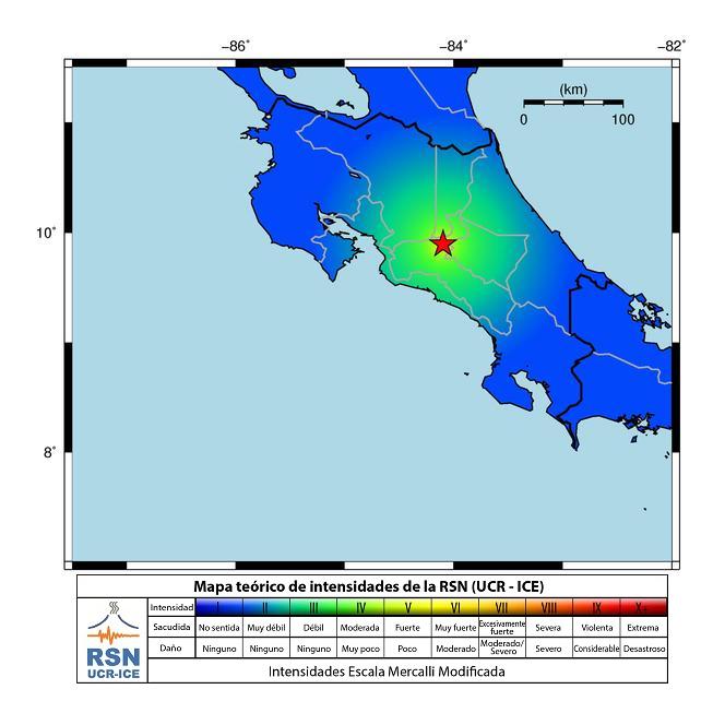 Mapa teórico de intensidades, sismo de mayor magnitud, 1:23 am