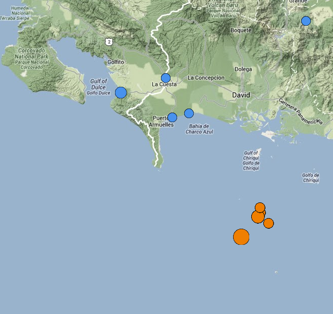 El siguiente mapa muestra los epicentros de los sismos principales en color anaranjado. Los círculos azules corresponden con los sismos ocurridos durante la última semana, especialmente en la zona de la península de Burica. La RSN se mantiene al tanto de esta actividad sísmica.