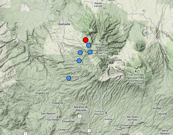 SENTIDO: 3-8-2013, Hora: 11:23 pm, 6 km al Noreste de Tapesco de Zarcero, Prof: 9,8 km, MAG: 3,0 Mw
