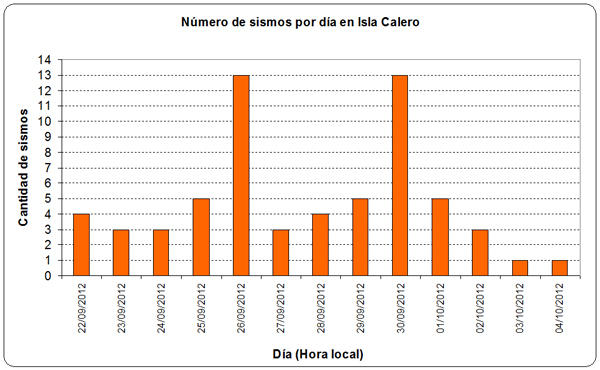 El siguiente histograma muestra la evolución de la sismicidad en Isla Calero, desde el 22 de setiembre hasta el 4 de octubre, localizada por la Red Sismológica Nacional (RSN: UCR-ICE). Aquí se evidencia la presencia de dos picos de sismicidad, los cuales corresponden con los días 26 y 30 de setiembre con un máximo de 13 sismos cada uno, mientras que los días de menor actividad corresponden con los días 3 y 4 de octubre con 1 sismo cada uno. El histograma muestra los sismos localizados en la hora local de Costa Rica (Anteriormente presentamos una animación de la evolución de la sismicidad hasta el 1 de octubre, pero utilizando el horario UTC ó Coordinated Universal Time, usado en Sismología y para el cual se suman 6 horas a la hora de Costa Rica). Aún continuamos analizando la sismicidad ocurrida durante los días del 22 al 30 de setiembre, por lo que el número de sismos registrados durante esos días podría ser mayor al mostrado actualmente. En total, hemos localizado 63 temblores.