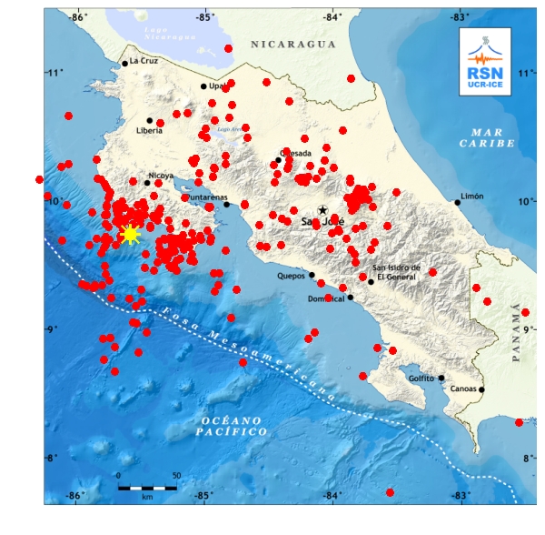Este mapa contiene los epicentros de 317 réplicas y sismos localizados por la Red Sismológica Nacional después del terremoto del miércoles 5 de setiembre. La estrella amarilla muestra el epicentro del sismo principal.