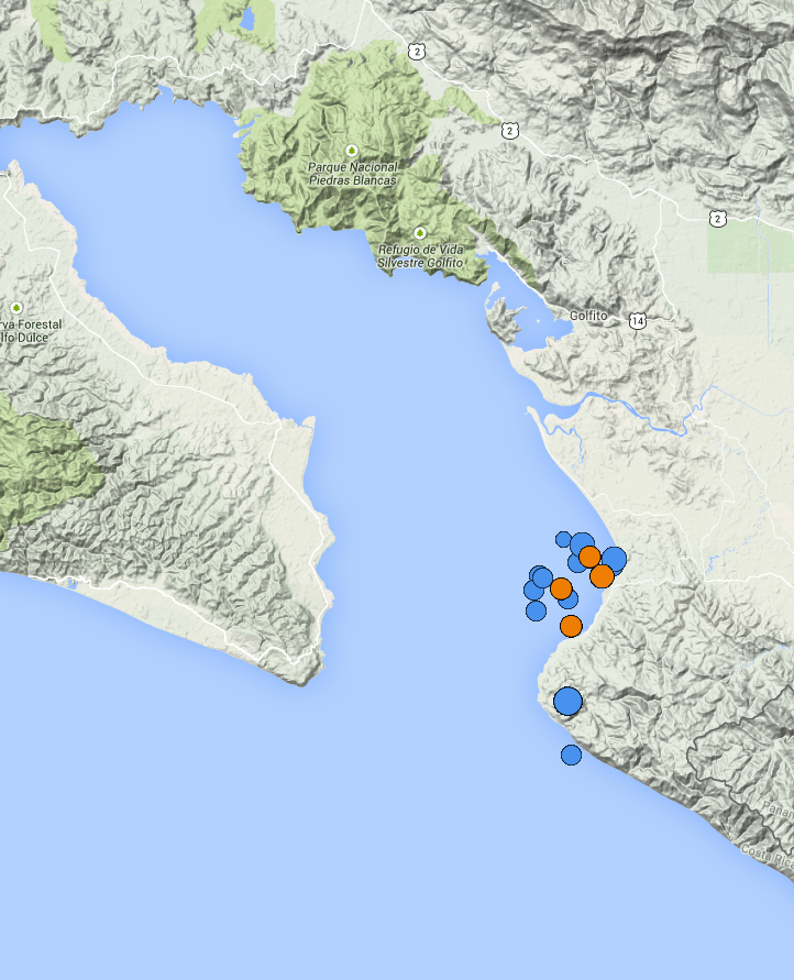 Durante el mes de octubre del 2014 se ha registrado una importante actividad de sismos en la zona del distrito de Pavón de Golfito. El origen de estos sismos corresponde con fallas locales. En esta zona existe una alta densidad de fallas activas debido a la cercanía del punto triple o contacto entre las placas tectónicas del Coco, Nazca y Caribe (microplaca de Panamá). Los sismos en esta zona son muy frecuentes. El sismo de mayor tamaño ocurrió el 10 de octubre y tuvo una magnitud de 5,1 mw. Es habitual la ocurrencia de réplicas luego de sismos de magnitud mayor a 5,0. La RSN permanece al tanto de la actividad sísmica.