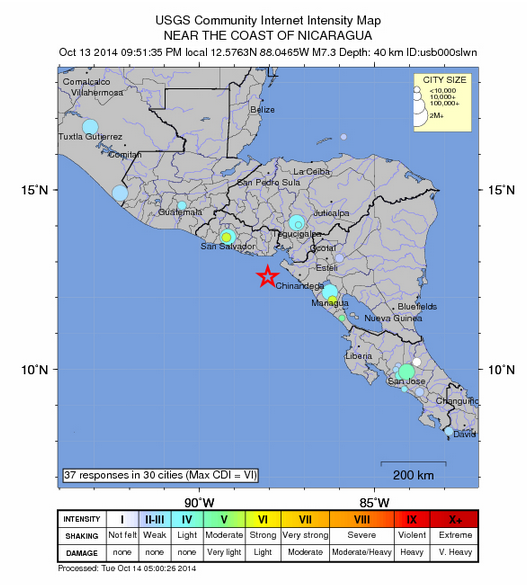 Esta noche, 13 de octubre del 2014, se han sentido dos sismos en gran parte de Costa Rica. El primero ocurrió a las 9:31 pm, tuvo una magnitud de 5,3 Mw y se localizó 37 km al Suroeste de Bahia Ballena, Osa. El segundo sismo ocurrió 20 minutos después, a las 9:51 pm, con epicentro en las costas del Golfo de Fonseca entre El Salvador y Nicaragua y con una magnitud de 7,3 Mw. El origen de ambos sismos es el proceso de subducción de la placa del Coco. En el caso del sismo de Costa Rica a las 9:31 pm, a un nivel superficial (10 km), y en el caso del sismo de las 9:51 pm en El Salvador, a una profundidad intermedia (40 km aproximadamente).
