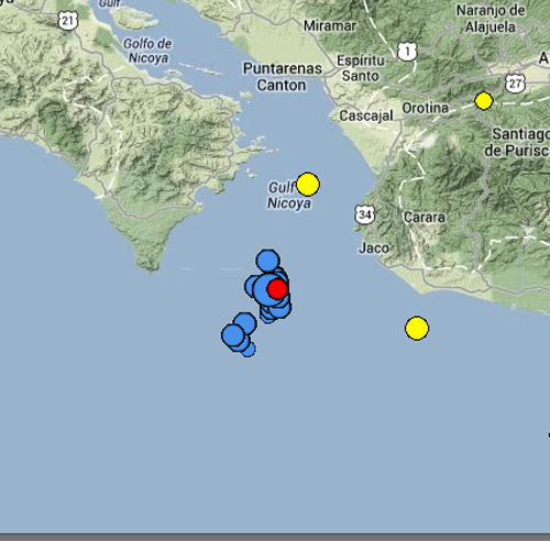 Luego del sismo de las 3:02 pm del viernes 17 de enero del 2014 ubicado 29 km al oeste de Jacó (ó 34 km al sureste de Cóbano), la Red Sismológica Nacional (RSN: UCR-ICE) ha localizado 26 réplicas con magnitudes de entre 2,7 y 3,6 Mw. La réplica de mayor tamaño (Mag. 3,6) ocurrió a las 7:09 pm del día viernes. Las réplicas más importantes son los siguientes: