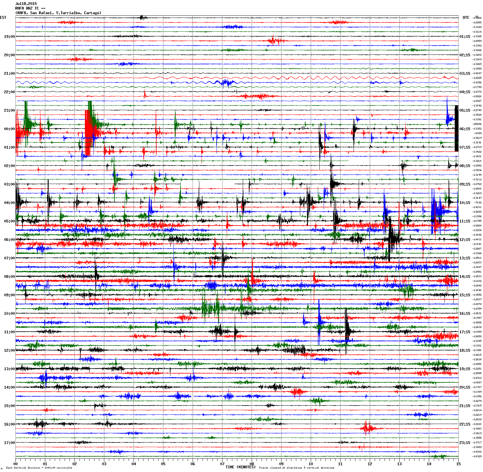Así luce la estación de la RSN en San Rafael de Irazú a las 2:30 pm. del 18 de julio del 2015, mostrado el registro de gran cantidad de microsismos en la zona durante el día.
