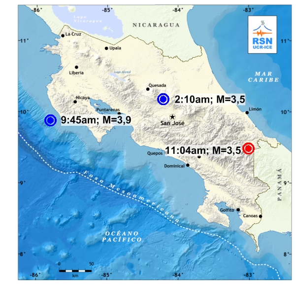El siguiente mapa muestra los sismos más importantes registrados por la Red Sismológica Nacional (RSN: UCR-ICE) durante la mañana del 25 de noviembre. En rojo se muestra un sismo (3,5 Mw) ocurrido a las 11:04 am originado por fallamiento local y localizado 22 km al suroeste de Bratsi de Talamanca. En azul, se muestran los epicentros de los sismos originados por el proceso de subducción de la placa del Coco. De estos uno ocurrió a las 9:45 am (3,9 Mw), tuvo su epicentro 28 km al oeste de Sámara y fue reportado como sentido en Nosara, Tamarindo y Marbella, en la península de Nicoya. El otro sismo ocurrió a las 2:10 am (3,5 Mw), se localizó 4 km al oeste de Varablanca de Heredia a una profundidad de 91,8 km. Los sismólogos de la RSN vemos esta actividad sísmica como normal y recordamos que Costa Rica es un país de alta sismicidad por lo que siempre debemos estar debidamente preparados para enfrentar los sismos, ya que no sabemos cuando ni donde ocurrirá el siguiente sismo fuerte.
