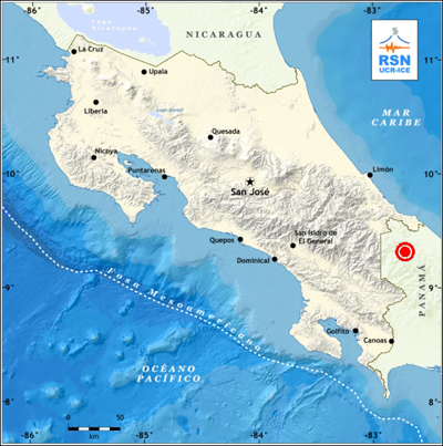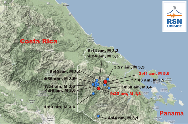 Las localizaciones brindadas por la RSN son siempre revisadas por un sismólogo antes de ser emitidas. La localización difundida en esta ocasión fue revisada y enviada 20 minutos de ocurrencia del sismo. Esta localización se caracteriza por ser de muy buena calidad ya que incluye datos de 43 estaciones, la mayoría en suelo costarricense, pero también en la república de Panamá, lo cual permite tener cobertura de estaciones alrededor del epicentro. El gap azimutal de estaciones es de 75 grados. Las estaciones sismológicas de la RSN que se encuentran más cercanas al epicentro son las ubicadas en el Refugio Gandoca-Manzanillo a sólo a 32 km y en Bribrí de Talamanca a 39 km. En la siguiente figura se muestra el sismograma de la estación Gandoca en donde se señala el evento principal de magnitud 5,6 Mw en azul y la réplica más grande registrada hasta 1 pm, la cual ocurrió a las 9:22 am y tuvo una magnitud de 4,3 Mw.