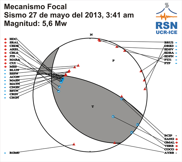 El mecanismo focal es una representación gráfica de dos posibles soluciones de la ruptura que origina un sismo y de la configuración de los esfuerzos tectónicos en el área. En otras palabras es un compendio de informaciones que describen el posible mecanismo de falla en la fuente donde se libera la energía en forma de ondas sísmicas. Existen tres tipos de fallas principales de acuerdo con el estilo de movimiento: Normal, Inversa y Desplazamiento de Rumbo. Uno de los métodos para obtener la solución del mecanismo focal de un sismo consiste en la identificación de la llamada "polaridad" de las primeras llegadas que se registran en un sismograma. Este procedimiento de lectura se efectúa en cada una de las estaciones sismológicas que registran el evento sísmico. La solución del mecanismo focal del sismo de esta madrugada 27 de mayo del 2013 a las 3:41 am, coincide con el de una falla inversa, que tiene un estilo de movimiento como el que se observa en la animación del siguiente enlace: http://www.youtube.com/watch?v=4b81nXSVA34 Los parámetros técnicos de la solución de este sismo que son útiles para los geólogos y estos son: Strike: 291, Dip: 66 y Rake: 74.