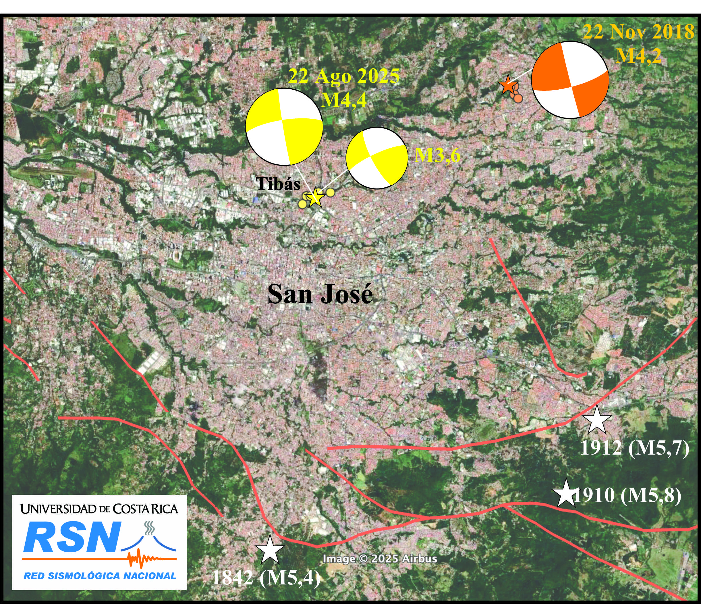 Durante el 22 de agosto del 2025 se ha presentado una actividad sísmica relevante en el sector de Tibás, al norte de San José. El sismo más importante hasta ahora ocurrió a las 12:45 am., con una magnitud de 4,4. Se han presentado unas 10 réplicas más con magnitudes entre 2,3 y 3,6 (círculos amarillos en el mapa). La réplica de mayor tamaño de 3,6 ocurrió a las 4:55 pm.