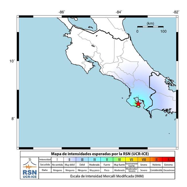 Intensidades: Sentido fuerte en la Zona Sur, con caída de objetos en Puerto Jiménez, y leve en el Valle Central.