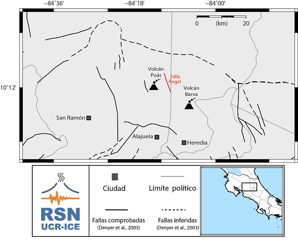 Según Montero et al. (2010), las fallas que rodean el macizo del volcán Poás son capaces de generar sismos de magnitudes máximas inferiores a 6,5. Específicamente, dada la longitud de la falla Ángel y según las relaciones empíricas Wells & Coppersmith (1994), puede generar sismos máximos de entre 6,5-6,6 (Mw).