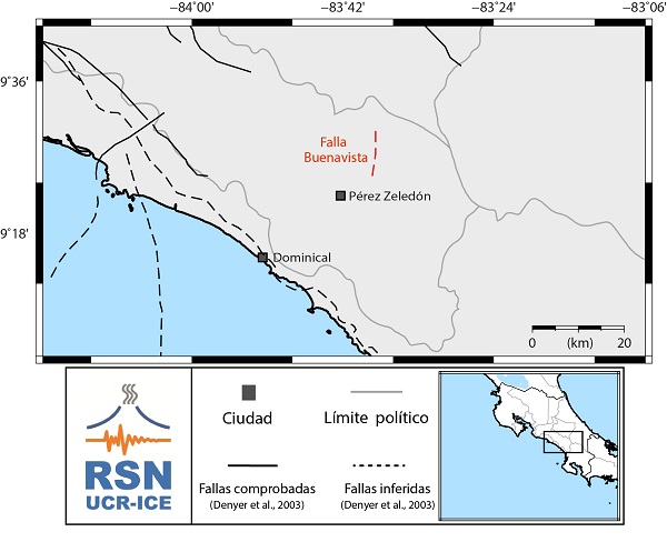 Tanto Boschini et al. (1988), así como Montero et al. (1998), Montero (2001) y Alvarado et al. (2009), presentan observaciones concordantes sobre esta falla; con una orientación promedio N5°W y un fallamiento dextral con un plano de falla vertical. No obstante, como la falla era desconocida hasta el terremoto de Buenavista del 3 de julio de 1983 (Ms 6,1), no se tienen registros de movimientos anteriores por lo que no es posible establecer su periodo de recurrencia ni su tasa de movimiento.