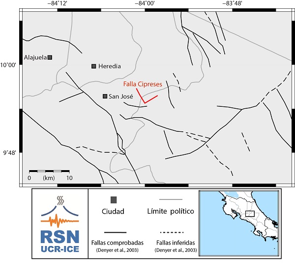 De acuerdo con Montero & Fernández (2002) la falla Cipreses y el sistema de pliegues asociados se ubican entre Granadilla de Montes de Oca y Tres Ríos, con un rumbo noroeste y este-oeste. Además, según Montero et al (2005) se puede extender al oeste bajo la zona este de San José y limitado al sur con la falla Río Azul.