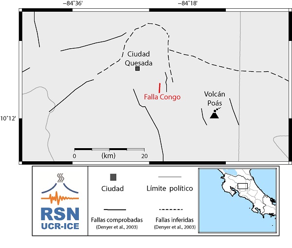 Se evidencia por un escarpe juvenil con facetamiento rectangular de 40 m de altura, el cual, en asociación con un contraescarpe, ha generado una laguna efímera (laguna Congo) por represamiento del drenaje (Alvarado et al., 1988; Montero et al., 1998; Montero, 2001).