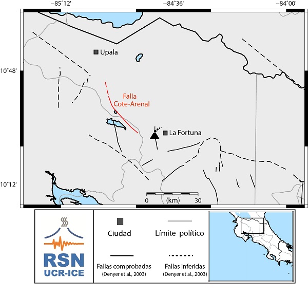 Ubicada en las inmediaciones de la Cordillera de Tilarán, específicamente al norte del Lago Arenal, donde la falla se encuentra atravesando la Laguna Cote.
