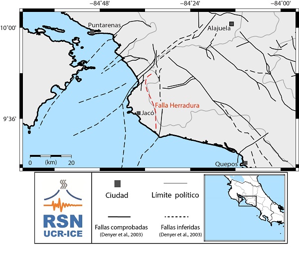 Se encuentra ubicada al sur de Orotina, específicamente en el promontorio de Herradura, entre las fallas Camaronal (al suroeste) y Delicias (al noreste). En conjunto con estas últimas fallas, conforma el sistema de falla Bijagual.