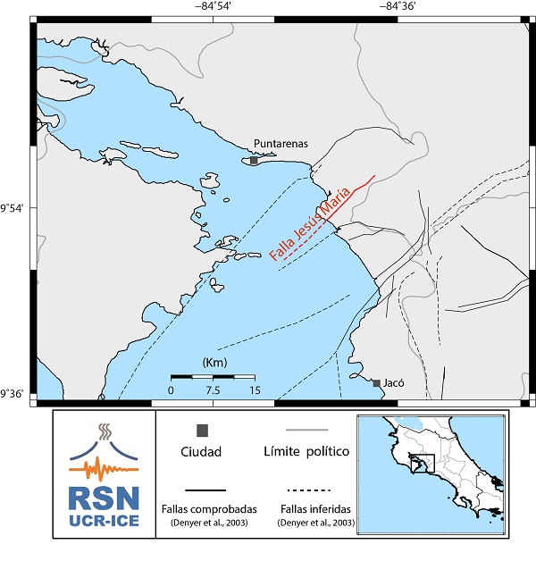 La falla Jesús María se ubica al noreste del Golfo de Nicoya (Barquero & Alvarado, 2011). Su extensión abarca no solo parte de la plataforma continental en la parte este del Golfo de Nicoya, sino que a su vez se prolonga a lo largo de la costa, en la zona entre Esparza y Orotina.