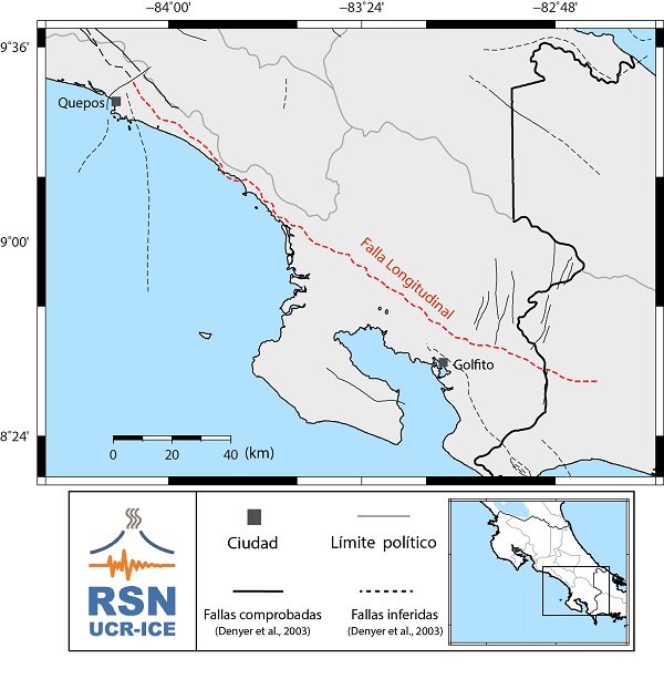 En Costa Rica se extiende desde el norte de Parrita hasta el noroeste de Paso Canoas, pero su traza continúa por varios kilómetros en la región panameña en donde, según Alvarado (2005), es denominada como falla Regional Chiriquí, falla Longitudinal-Celmira o Ballena-Celmira. En el sector comprendido entre Dominical y Embarcadero del Térraba, la traza de la falla puede variar. Según Denyer et al. (2003) la traza se ubica a lo largo de la costa, mientras que Alvarado (2005), basado en la observación de un grupo de islas, islotes y salientes rocosos, sitúa la traza mar adentro.