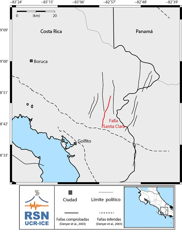 Se extiende unos 12 km en dirección norte sur atravesando el poblado de Santa Clara y pasando su traza unos 500 m al oeste de la Ciudad de San Vito (Arroyo, 2011). Denyer et al. (2003) le asignan a ésta falla una extensión de aproximadamente 24 km.