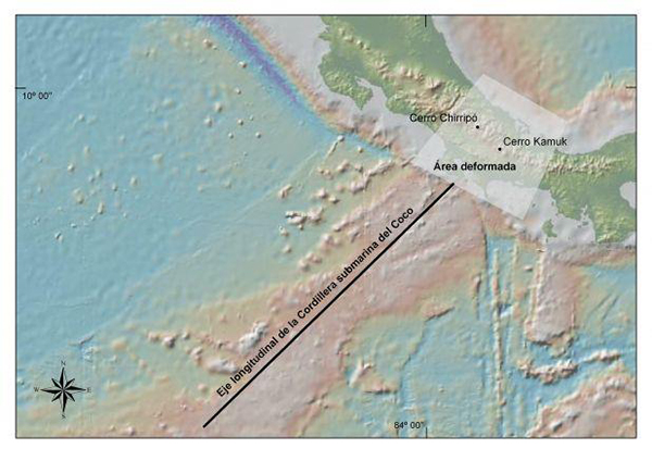 La Cordillera Submarina del Coco, denotada en color pardo-rosáceo en la imagen, es una cordillera compuesta por rocas volcánicas geológicamente jóvenes y se originó en lo que se conoce hoy como las Islas Galápagos, frente a la costa Pacífica ecuatoriana (Centro de Dispersión de Galápagos). Al haber allí una apertura en el fondo oceánico, el material salía y se solidificaba formando las lavas (magma solidificado) que hoy conforman dicha cordillera. El material emergente no solo ascendía verticalmente (como haciendo crecer la montaña) sino que era desplazado hacia el Noreste por el empuje de nuevos y grandes volúmenes de material que seguía saliendo además del arrastre generado por el movimiento de la placa tectónica.