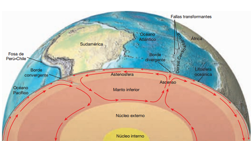 Por el contrario, la litosfera continental usualmente tiene un grosor comprendido entre 100 y 150 kilómetros, aunque puede alcanzar los 250 kilómetros en porciones más antiguas de los continentes. Debajo de la litosfera, se encuentra una región del manto muy dúctil, conocida como astenósfera, donde la temperatura y presión son tan altas que las rocas se encuentran en estado de fusión (rocas fundidas). Es sobre esta astenósfera que se “deslizan” las placas tectónicas. Se sostiene en la actualidad que las placas son desplazadas como resultado de un flujo convectivo (combinado, vertical y horizontal; ver figura 1) en el manto. Este flujo, impulsados por diferencias de temperatura (por ende de densidad del material) impulsa a las placas litosféricas, generando indirectamente la formación de las cordilleras montañosas así como la actividad volcánica (directa o indirectamente) y sísmica en todo el planeta. Se piensa que las plumas de rocas supercalientes que conforman el flujo ascendente del movimiento convectivo se generan en el límite núcleo-manto (donde la temperatura es máxima y la densidad mínima por consecuencia) y ascienden lentamente a la superficie. La parte horizontal del flujo (flechas horizontales) es la que arrastra a las placas provocando su colisión o bien su separación y finalmente se agrega que posiblemente los bordes de placas convergentes (donde las placas frías y densas de la litosfera se subducen) coinciden con un flujo descendente en el manto.