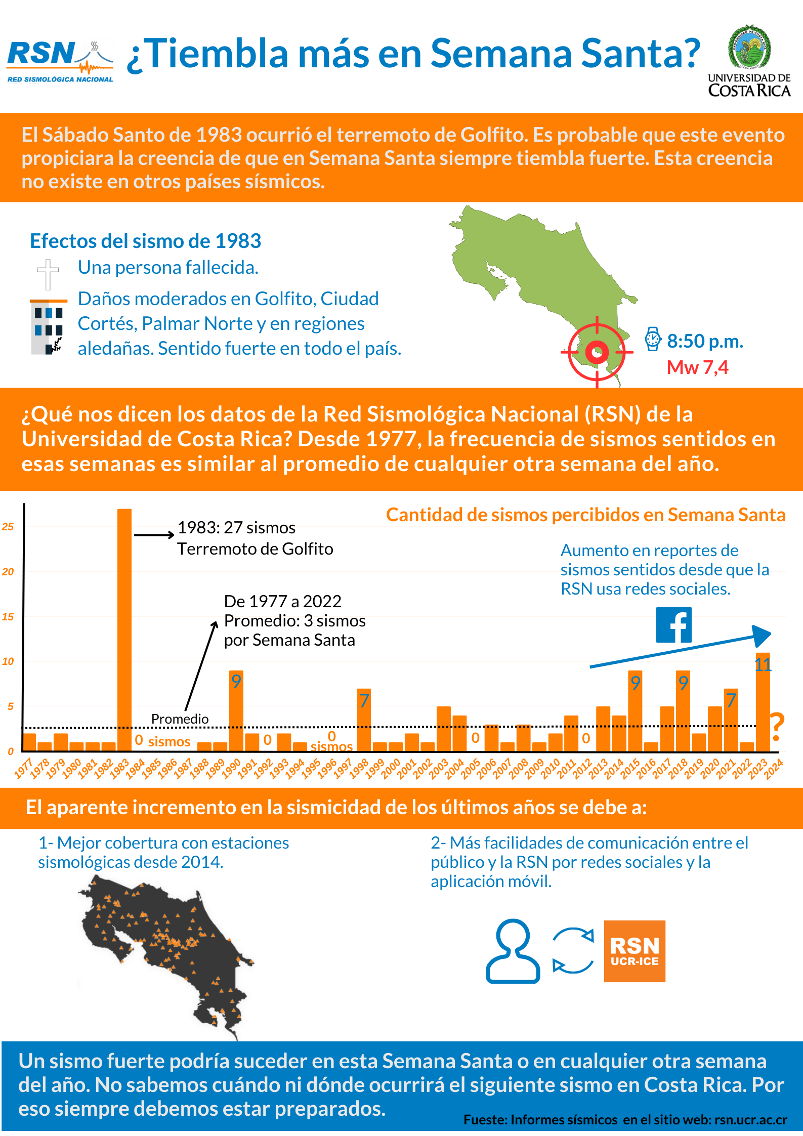 La infografía que acompaña este texto muestra la cantidad de sismos sentidos por la población durante las semanas santas a lo largo de 47 años de registro continuo de la Red Sismológica Nacional (RSN) de la Universidad de Costa Rica. En el gráfico consta un único pico en la sismicidad durante la Semana Santa de 1983, cuando ocurrió el terremoto de Golfito (o del Sábado Santo). Además, figuran 10 años en los cuales no se percibieron sismos del todo y solo se registraron de forma instrumental. Estos números derriban el mito de que siempre tiembla fuerte en la Semana Santa y además indican que el promedio de la sismicidad durante las semanas santas es similar al de cualquier otra semana del año. En la infografía se observa además un aumento de reportes de sismos sentidos durante la última década, también presente en otras semanas del año, y esto se debe a que en este periodo reciente existe mayor facilidad en la comunicación debido al uso de dispositivos inteligentes y redes sociales, así como una mejor cobertura de estaciones sismológicas que permite localizar sismos más pequeños.