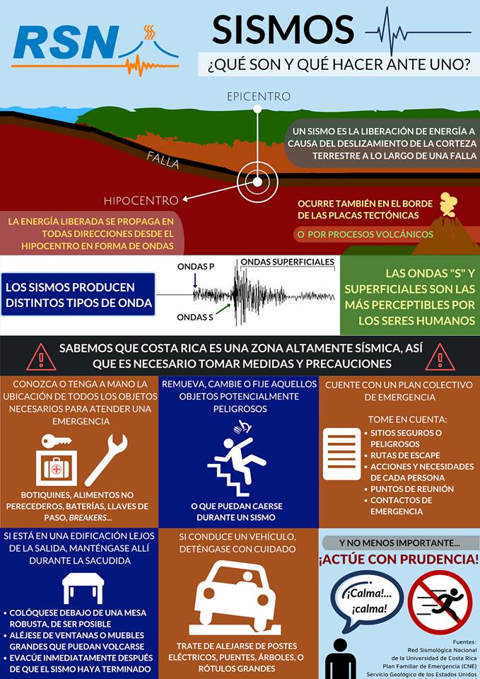 ¿Qué son los sismos y qué hacer ante uno? Categoría: Sismología 03 May 2019 03 May 2019 La Red Sismológica Nacional explica en la siguiente imagen las condiciones que permiten que haya un sismo, así como las medidas que debemos tomar ante uno: Diseño: Justin Leiva (Comunicación de la Red Sismológica Nacional: UCR-ICE)