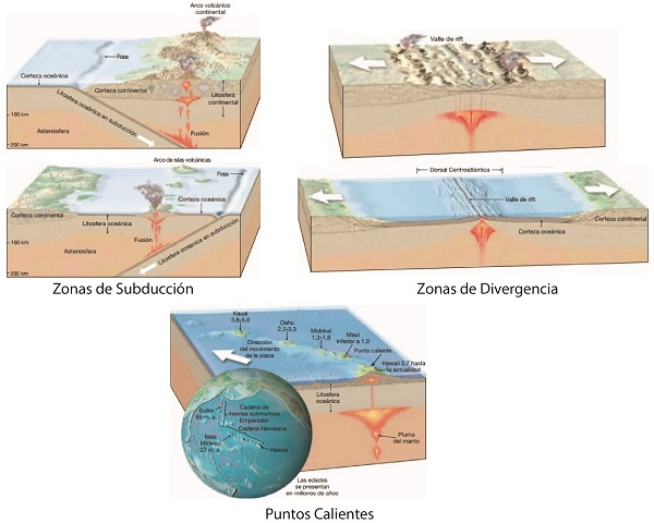 Los procesos volcánicos se originan en tres tipos de ambientes geológicos: