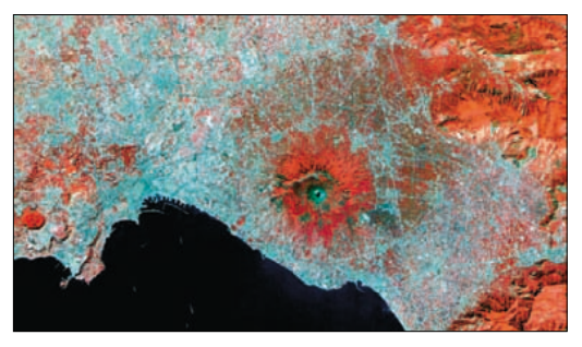 Imagen del Monte Vesuvio, en Italia, en septiembre de 2000. Este gran volcán está rodeado por la ciudad de Nápoles y la Bahía de Nápoles. (Imagen cortesía de la NASA.) Fuente de la imagen: Tarbuck, E. & Lutgens, F., 2001: Ciencias de la Tierra: una introducción a la geología física [6ª ed.].- 540 págs. Prentice Hall, Madrid España.