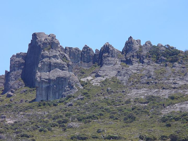 En la foto se observan las columnas o “dedos” de andesita de Los Crestones, separadas por grietas.