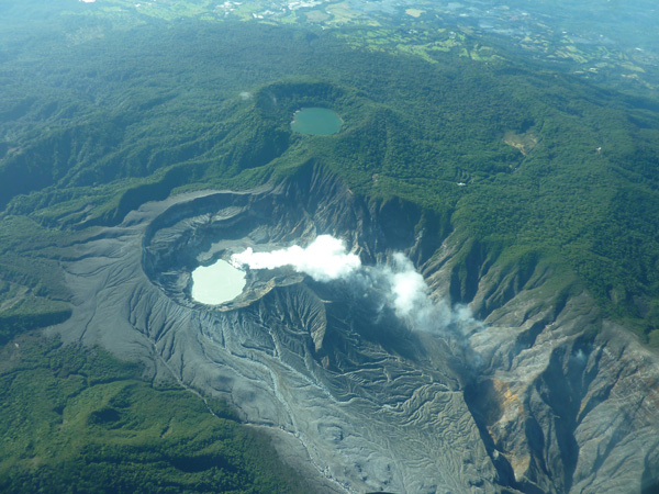 Fotografía: fuente RSN. Se observa desgasificación intensa de la laguna caliente, en el cráter principal, que provoca lluvia ácida y por ende la muerte de vegetación cercana en la llamada "zona de la muerte". En la parte superior se ubica la laguna Botos, antiguo foco de actividad.
