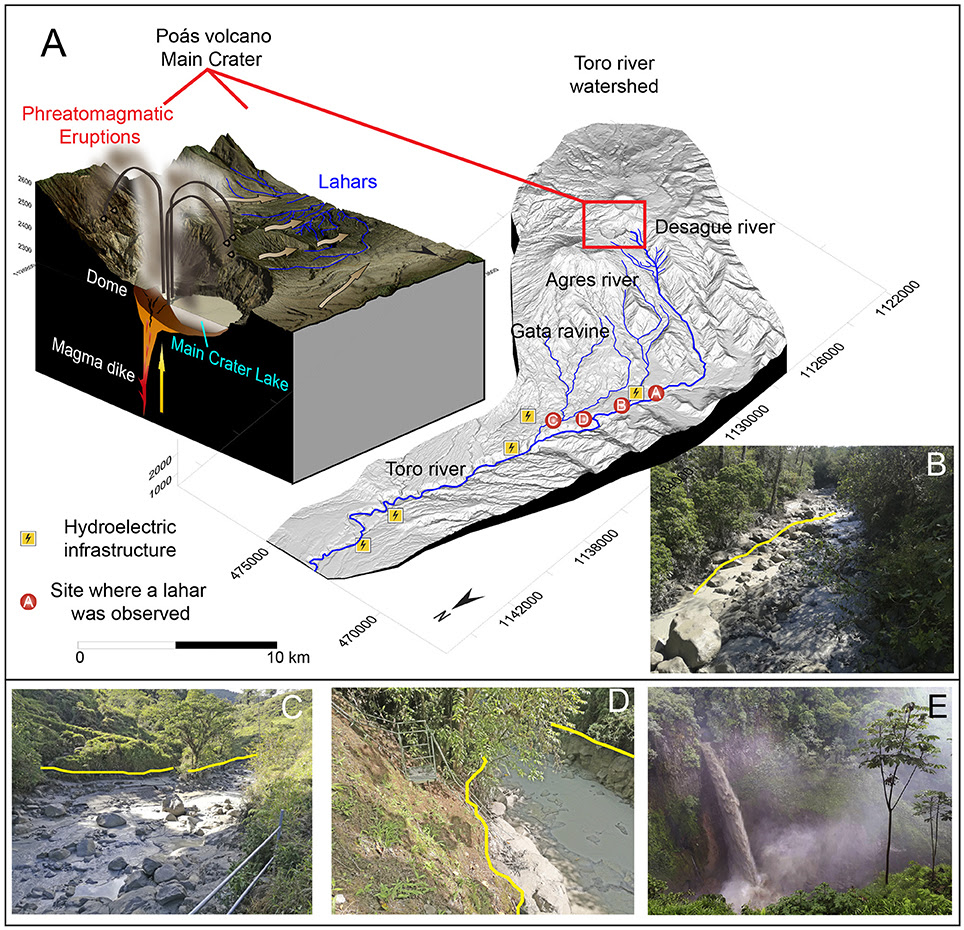 En la imagen: En abril del 2017 una erupción freatomagmática en el cráter principal del volcán Poás expulsó agua, sedimentos y material juvenil hacia el aire que luego se encausó generando lahares. En la figura A se observa un esquema de cómo pudo ser esa erupción y y el trayecto de los lahares. En las fotografías se observan los ríos impactados por los flujos de lodo.